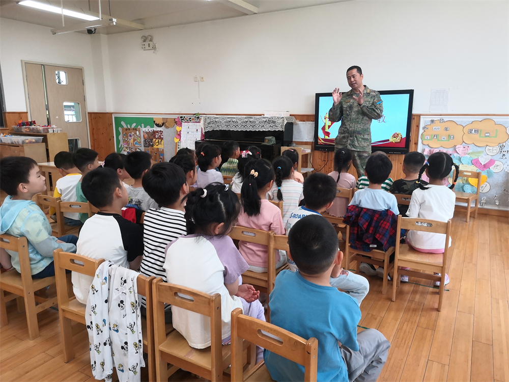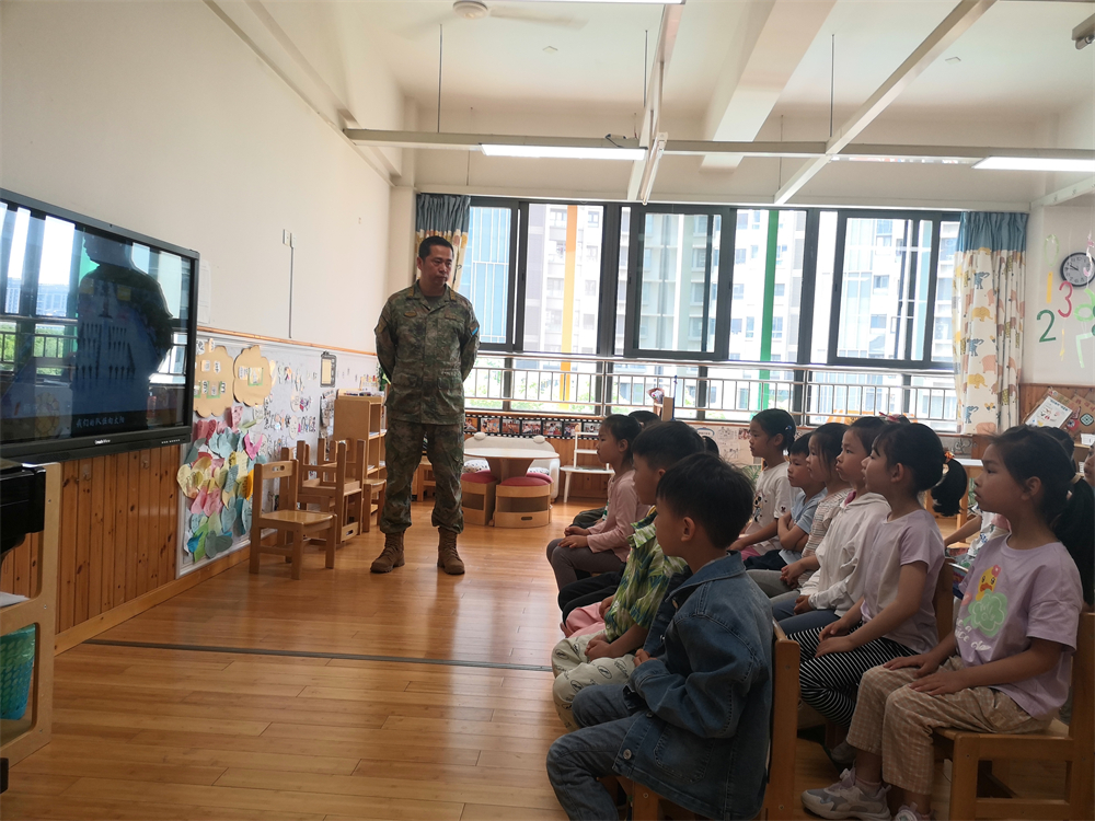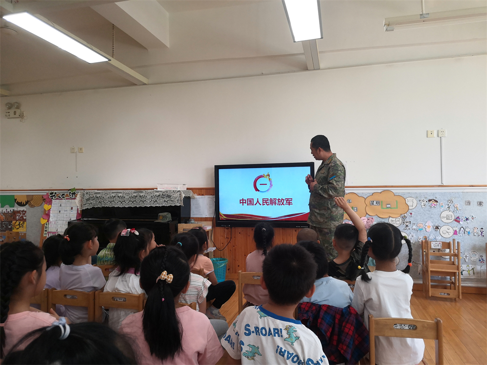 平日保家卫国的铮铮男儿在面对幼儿园的小朋友时却有着别样的柔情,解放军叔叔们耐心地帮小朋友们端平手臂,手把手地教孩子们握拳的方法,一举一动都满载着对幼苗的呵护与期望。