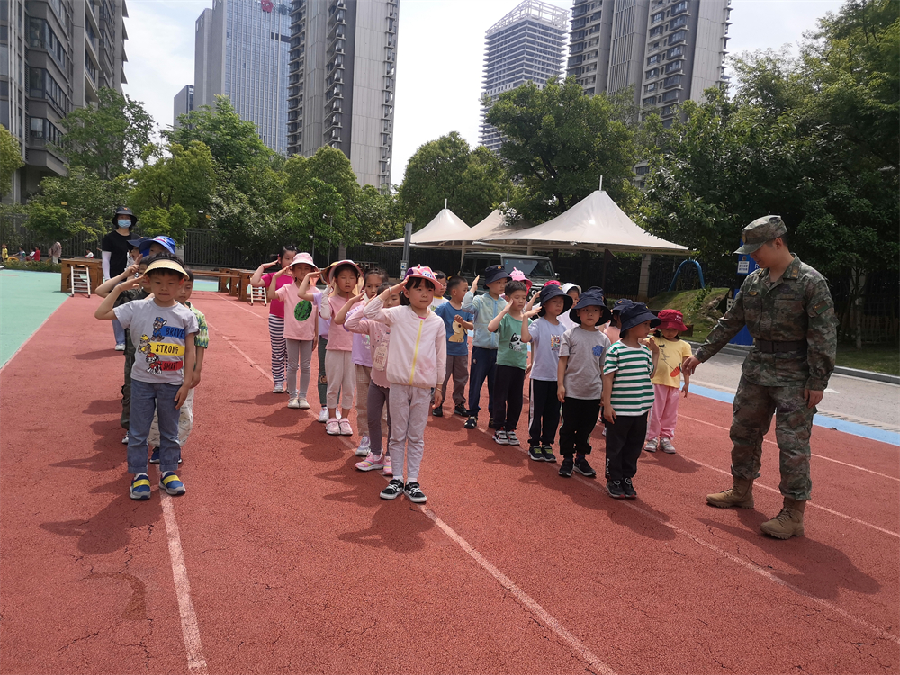最让孩子们激动的莫过于在操场上跟着解放军叔叔一起训练了。叔叔们先给孩子们做了示范演练,接下来就该孩子们上场了。“立正”、“稍息”、“敬礼”、“一二一”……在解放军叔叔响亮而有力的口号声中,孩子们脸上挂着汗水,眼神却在炽热的阳光下闪烁着坚毅。他们站军姿、学敬礼;服从指挥、执行命令……俨然就是英气勃发的小小特种兵!