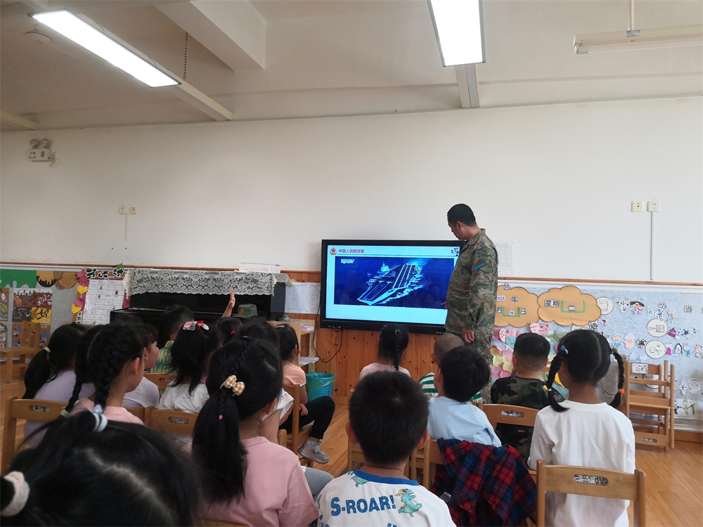 这支英姿飒爽的队伍,给孩子们进行了一场别开生面的国防教育。在大一班家长韩语恩爸爸的专业讲解中,孩子们了解了我国的四大军种——陆军、海军、空军、火箭军,不同的军种有着不同的服饰代表。当军旗随风扬起,军徽缓缓呈现时,嘹亮的军歌在孩子们耳边响起,这一刻,他们对解放军叔叔产生了崇拜的眼神!大家都说要学习解放军叔叔无畏无惧,保卫祖国,要学做小小解放军!