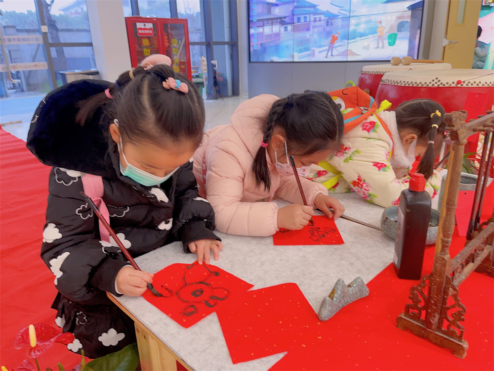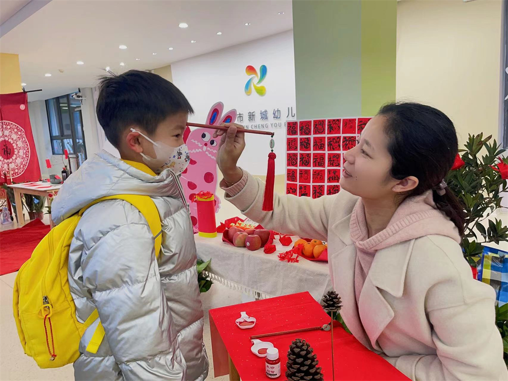 在隆重的入园仪式中,孩子们敲一敲新年鼓——一鼓作气;摸一摸新年果——万事顺意;跨一跨新台阶——平安喜乐;点一笔红朱砂——喜气洋洋;画一笔新年福——福气满满……孩子们相互分享着自己的假期生活,畅想着新年的游戏计划,幼儿园里的每一个角落都充满了生机勃勃,带着憧憬与希望,我们将开启新学期的快乐之旅。