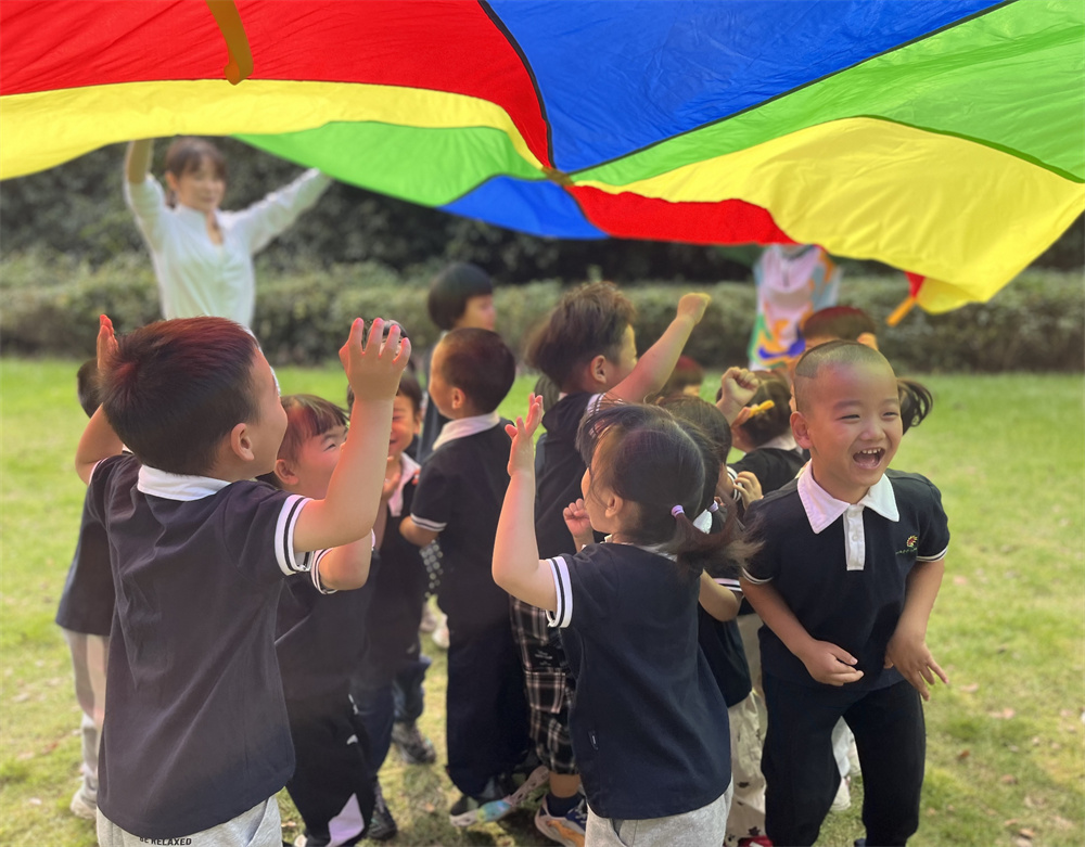 在融融的秋日里,孩子们和老师一起玩起了彩虹伞的游戏,他们化身为一条条小鱼穿梭在彩虹伞下,时而奔跑、时而跳跃,时而转圈圈,百变的彩虹伞给孩子们带来了无限乐趣。