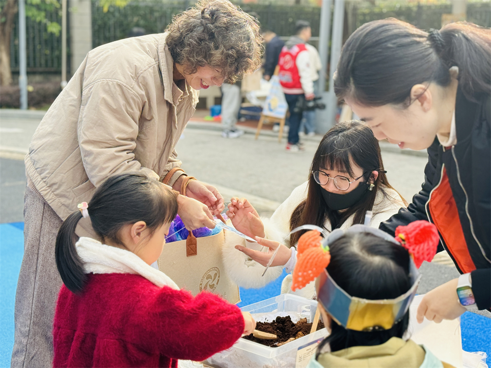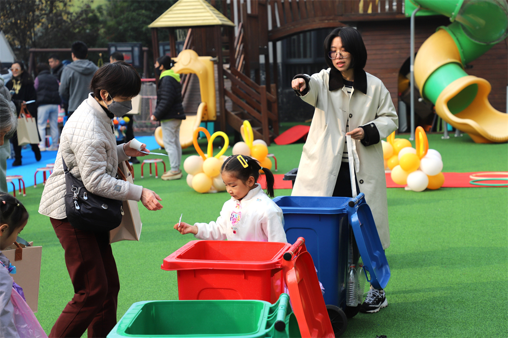 家长和孩子在玩乐中学习如何分类垃圾、节约用水和用电,以及如何减少塑料制品的使用。