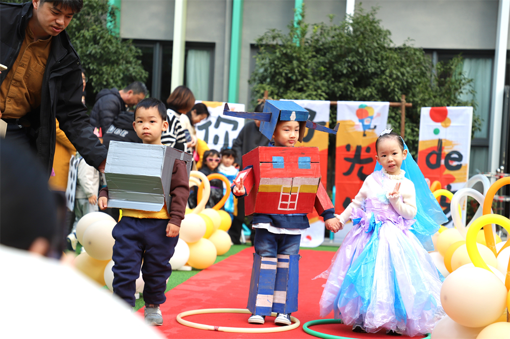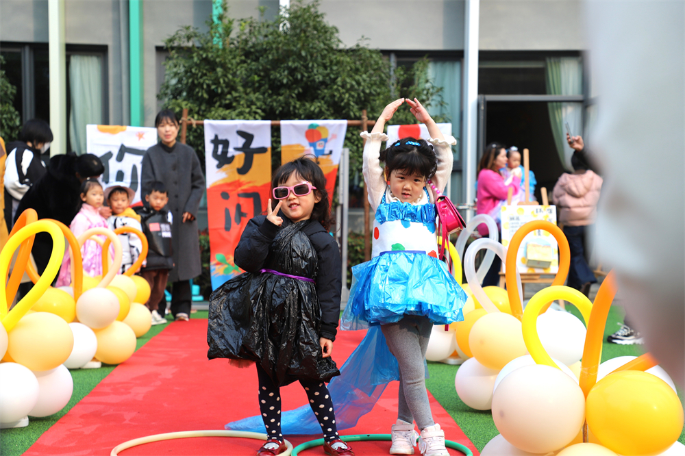 “环保时装秀”活动中孩子们化身“环保小模特”,身着由可回收材料制成的服装,自信地走上红毯,展现自己。每一件服装,都凝聚着孩子们天马行空的想象力和家长们巧手匠心的创意。从废旧报纸到塑料瓶,从旧衣物到布料边角料,这些看似无用的物品,在家长和小朋友的共同努力下,环保理念和生态互动融入游戏、融进生活,废旧材料被赋予了新的生命。这些创意十足的设计不仅让孩子们收获一份属于童年的艺术快乐,更是向社会提倡和宣传了合理利用资源的环保理念。