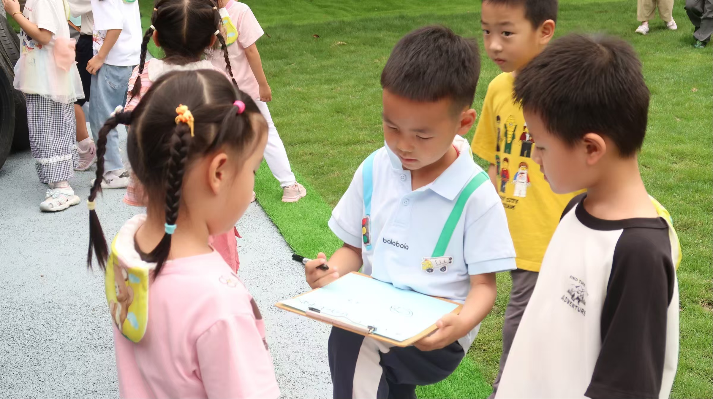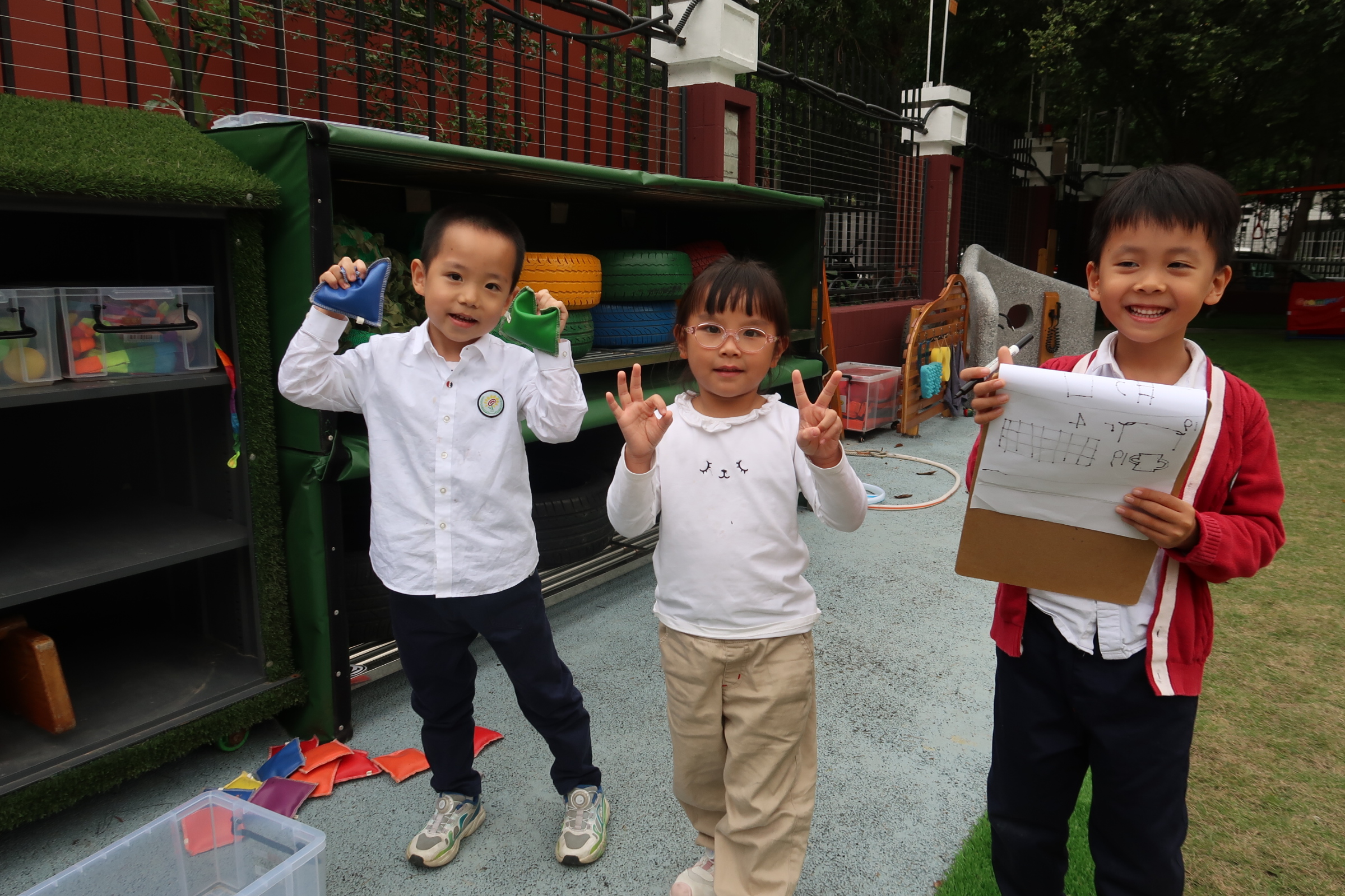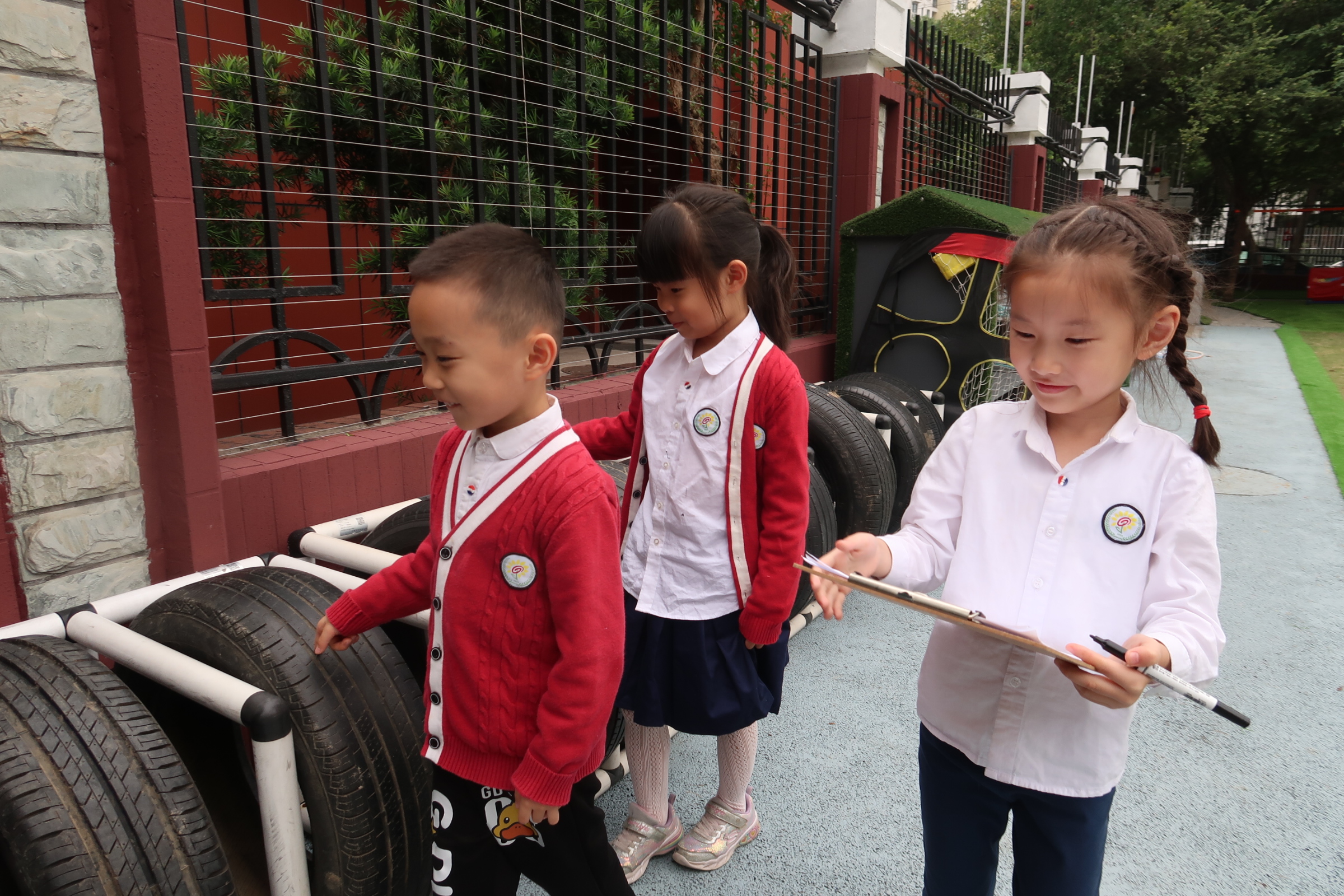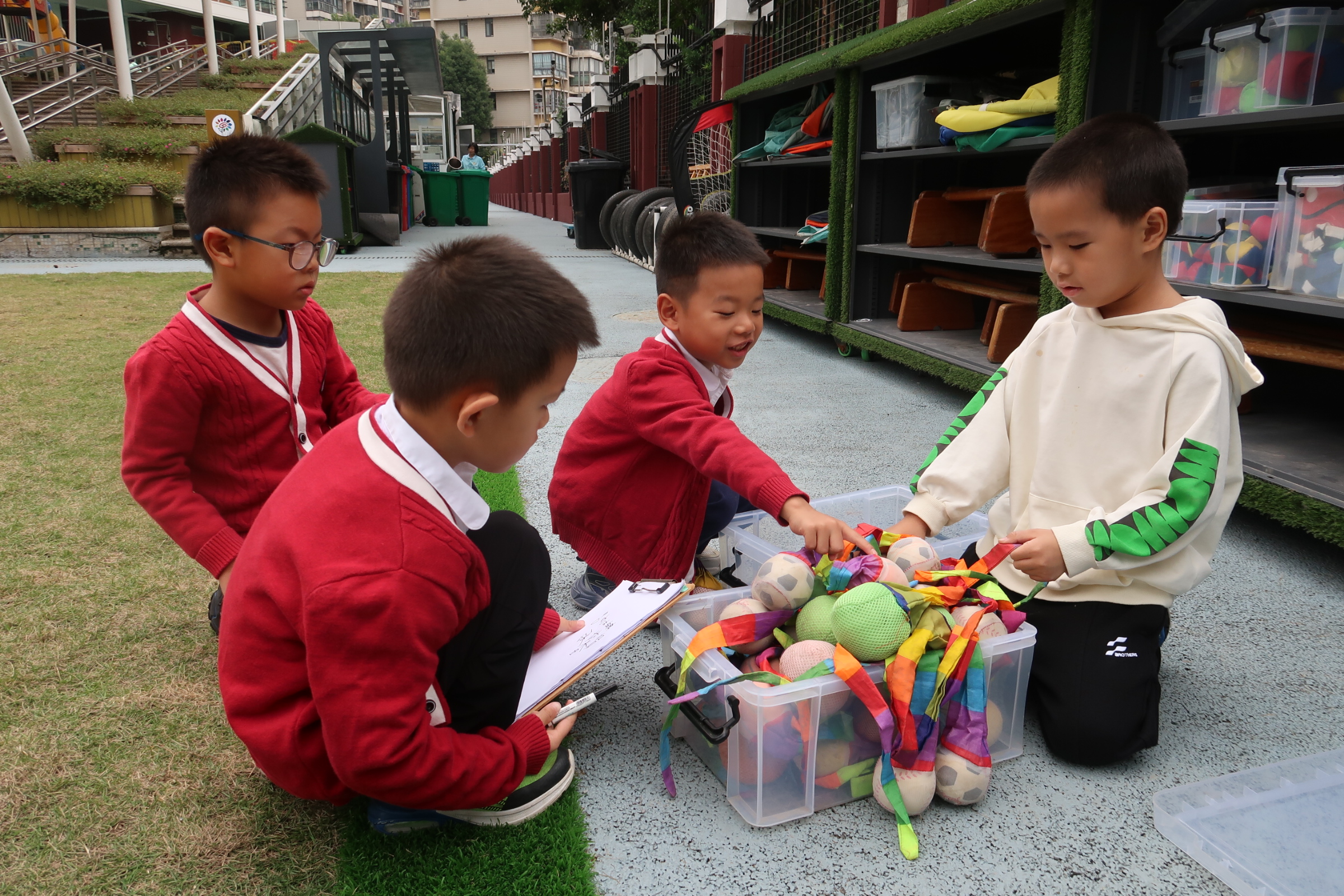 小朋友们分为球类组、木质器械组、轮胎及其他器械组三组进行材料清点,每一组里会有两名幼儿清点同一份材料,会有一名幼儿画表格、做记录。