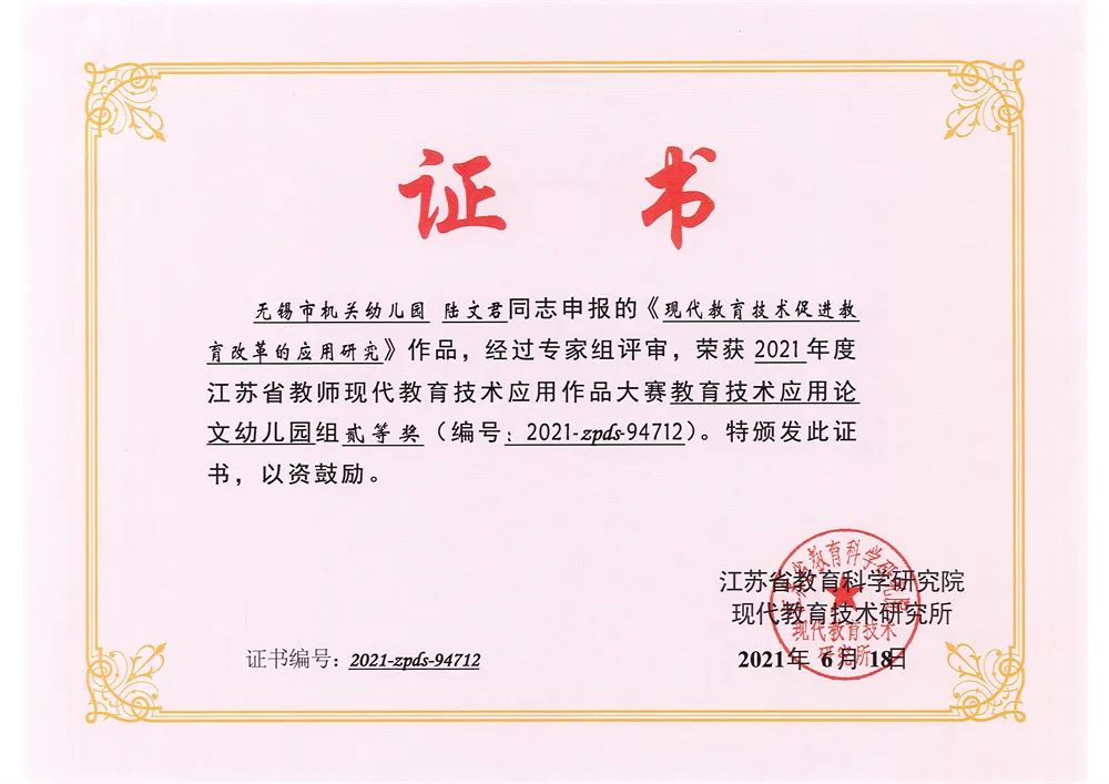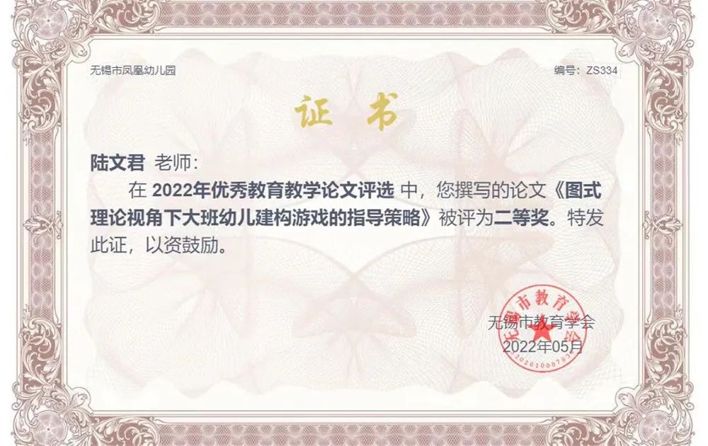 陆文君与周燕老师在2020年9月结为师徒,回望成长之路,陆文君老师特别感谢周老师在学习、工作和生活上给予她的帮助。当陆文君老师在日常工作中遇到问题时,周燕老师会及时沟通、指明方向,引导她少走弯路;当有最新教学理论时,周燕老师会第一时间和陆文君老师分享,鼓励她多多学习,提升专业素养。在周燕老师的指导下,陆文君老师迅速成长,她撰写的教育科研论文:《现代教育技术促进教育改革的应用研究》获得江苏省教育科学研究院二等奖,《图式理论视角下大班幼儿建构游戏的指导策略》获无锡市教育学会二等奖。除此之外,在周燕老师的引导下,陆文君老师获得了2021年无锡市直属幼儿园青年教师教学基本功大赛中获二等奖的佳绩。2022年11月在周燕老师的带领下,陆文君老师和同事们一起团结协作,奋楫争先,完成幼儿园省优创建工作。传承有源,前行有道,愿陆文君和周燕老师在携手同行的途中,一起收获更多成长的喜悦。