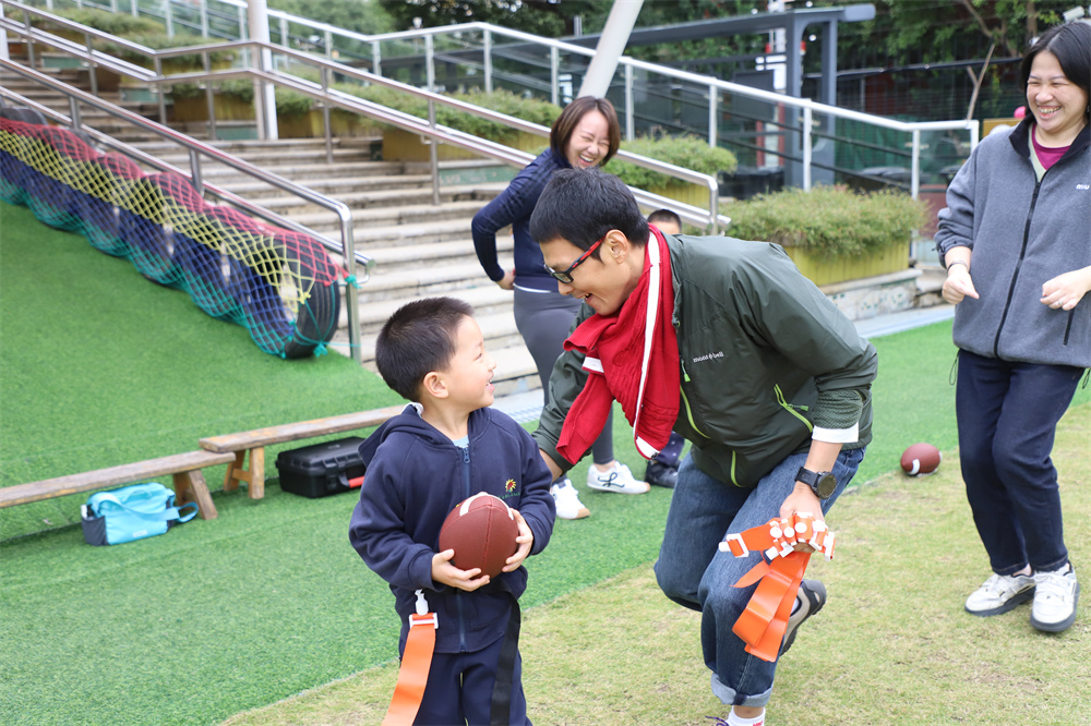 随着主持人宣布运动会正式开始,各项精彩的亲子运动游戏轮番上演。格子广场上,“蚂蚁搬豆”游戏别具特色,家长用绳子拉着呼啦圈,孩子们站在圈内抱着篮球,默契配合向前行进,考验着亲子协调能力。在大树基地,“守卫城堡”腰旗橄榄球比赛激烈进行,孩子们灵活地抱着橄榄球穿梭,家长们则化身“城堡卫士”,场面紧张又欢乐,每当有孩子的腰旗被拔下,现场爆发出阵阵欢笑。中二班教室里的“网中赶球”游戏创意十足,孩子们奋力将海洋球扔进网中,家长们则忙着将球赶出来,亲子间的互动让人忍俊不禁。还有“移动的长洞”“夺球奇兵”“羊角球大战”等趣味十足的项目,让活动现场变成了一片欢乐的海洋。