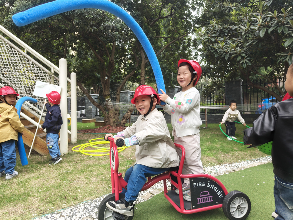 户外场地上,“小小消防员”们整装待发!头戴红色头盔,手握蓝色海绵“水枪”,孩子们两两一组,推着自制的“消防车”沿指定路线疾驰而过。“消防员来啦!小火苗快灭掉!”孩子们在游戏中模仿,在模仿中体验、在体验中成长。