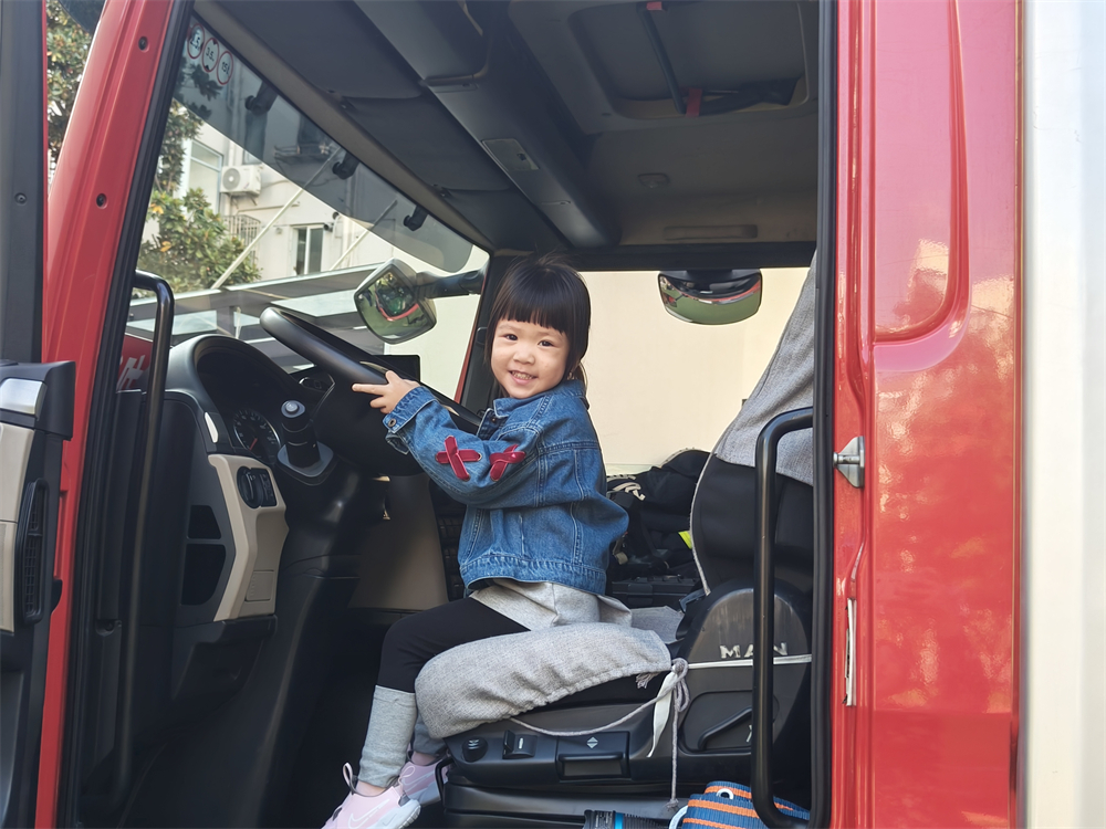“消防车来啦!”一声欢呼,点燃了整个校园的热情。红色的消防车停在幼儿园的操场上,孩子们兴奋地围拢过来,有的踮起脚尖触摸车身,有的坐上驾驶座,化身“小小消防员”;还有的争相与威武的消防车合影,定格下难忘的瞬间。