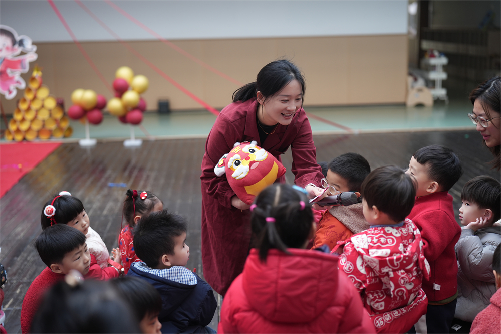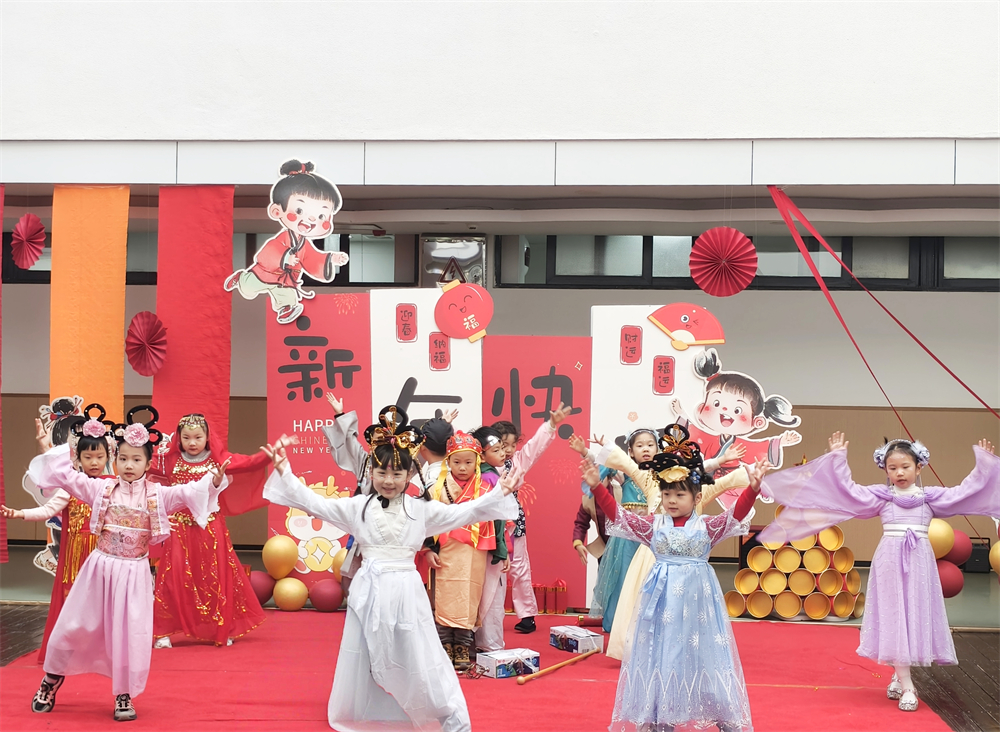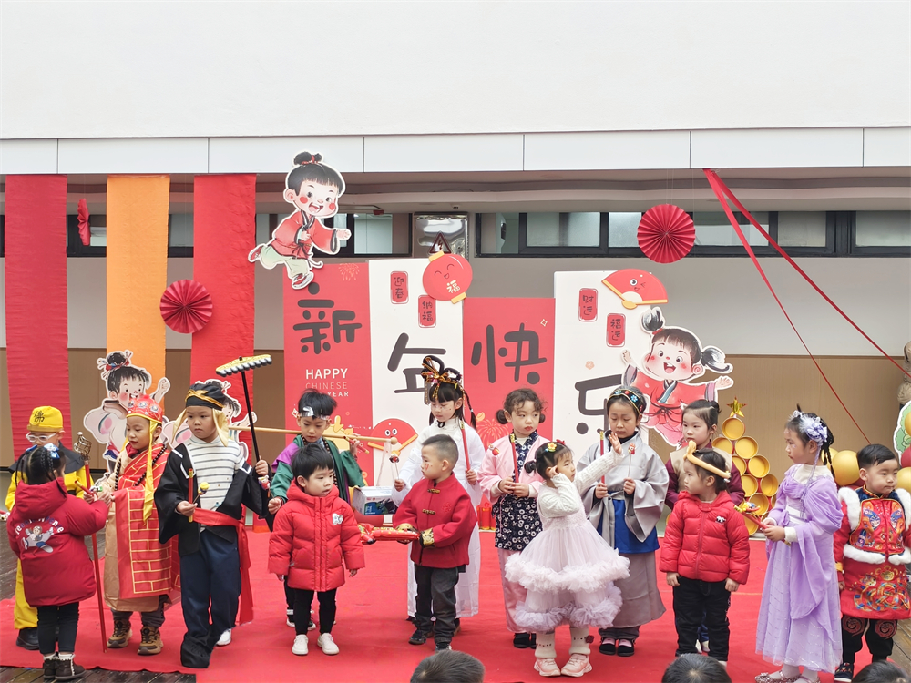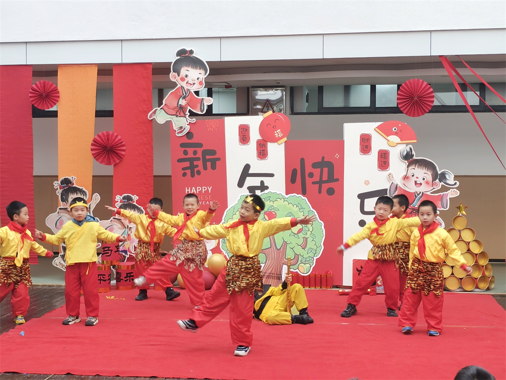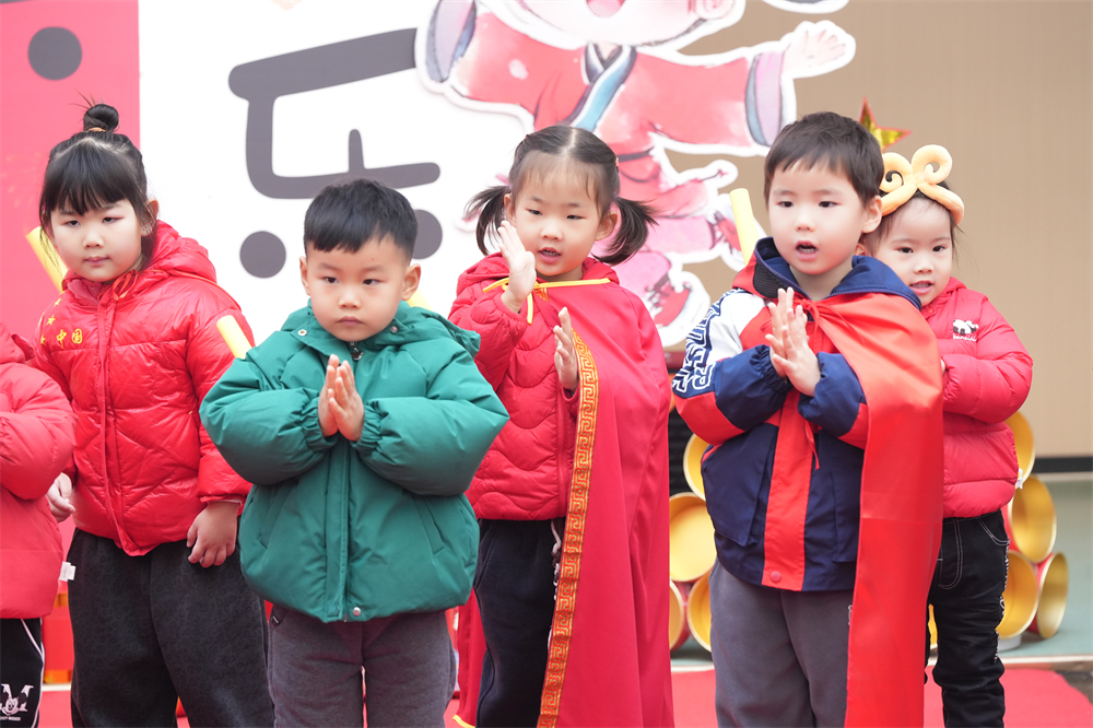 《上山打老虎》《你好》《棒棒糖》等曲目不仅旋律朗朗上口,更蕴含了语言表达、节奏感和情感培养的目标;通过《大家一起做体操》《小动物模仿操》等早操表演环节,展示了宝宝们的身体协调性和团队协作能力的发展;《新年好》《恭喜恭喜》等的欢快旋律传递着新年的喜悦;《和朋友碰一碰》《吹泡泡》把表演和游戏巧妙结合,让宝宝们在台上更加自主灵动;《孙悟空打妖怪》《小鱼游》《形状真好玩》组曲等表演的萌趣迎来阵阵掌声。
