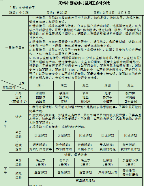 主题说明 冬爷爷来了,新年的脚步也就越来越近了,孩子们在打扮新年的教室、制作新年的贺卡、互道新年的祝福中感受新年来临的喜悦。冬天漫天飞舞的雪花是他们的最爱,在雪地里打雪仗、堆雪人,他们可以尽情地享受冬爷爷带给他们的特殊礼物。 本主题将从迎接新年的到来开始,通过各种有趣地探索活动,探索冬季的季节特征,从而大胆想象,用自己的的方式表现眼中的冬天。同时鼓励挑战自我,积极参加体育锻炼,战胜严寒。 一周计划