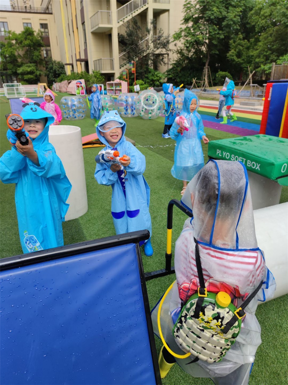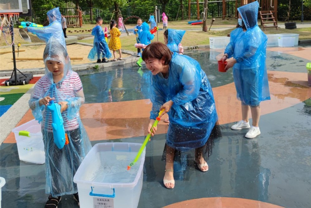 老师与爸爸妈妈们也提前给孩子们准备了充足物质准备,装满水的容器、水枪、小水球、瓢、一次性雨衣、更换的衣物等等。一切就绪,只等活动的开始。