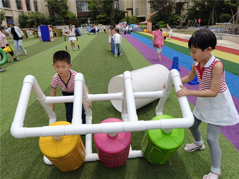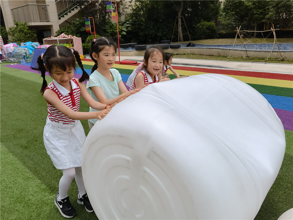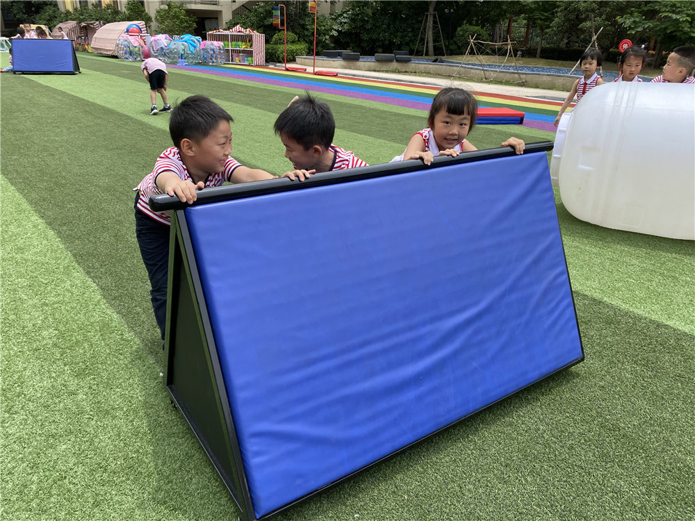 经过前期的精心策划,快乐的水仗游戏让每一个孩子都沉浸其中。活动前孩子们自行分成两队,经过一番激烈的讨论与取舍,群策群力探讨、齐心协力挪动体育器械,对游戏场地做了一番精心的规划。在满足就近取水的要求下,一个个掩体、一条条通道成型啦!