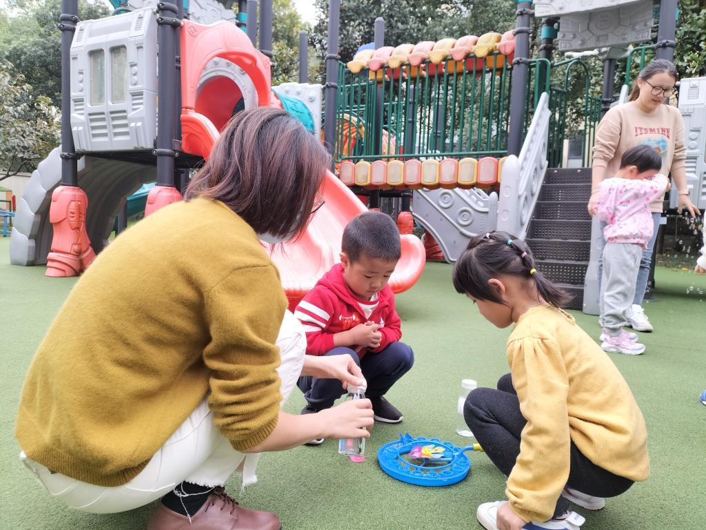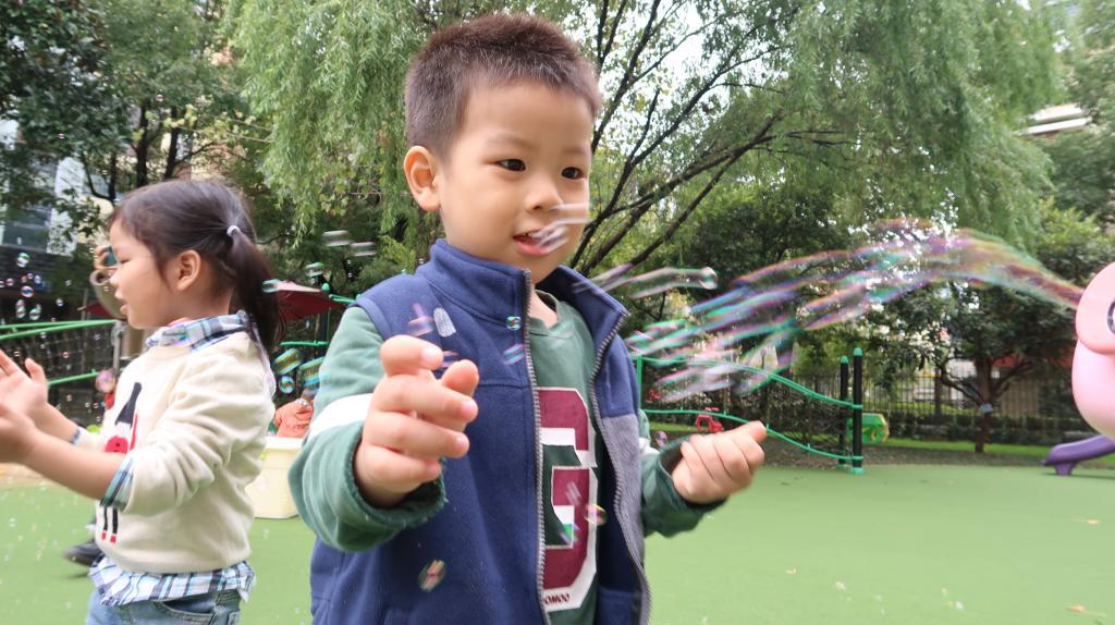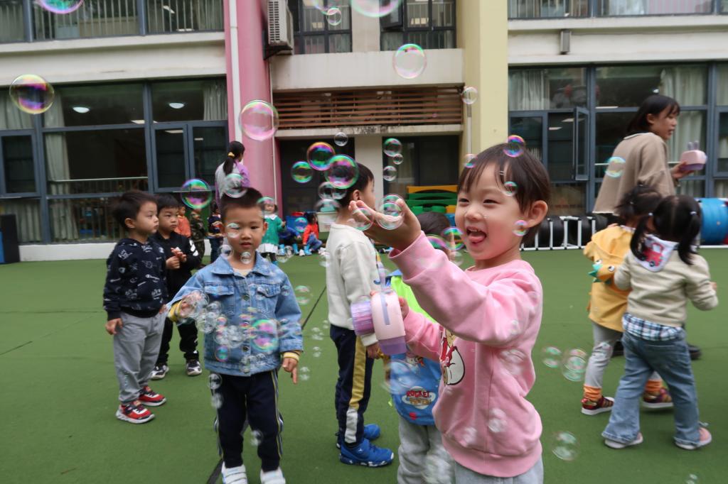 今天我们请来了家长助教管辰羽妈妈,管辰羽妈妈带来了不同操作方法的泡泡机,有的是按按钮的,有的是用小手挥一挥的,有的需要吹一吹,小朋友感受到了不同的吹泡泡方法。当五彩缤纷的泡泡飞起来,小朋友们的情绪一下子高涨起来,他们欢呼着,跳跃着,满操场地追泡泡,就连几个平时较腼腆的孩子,也被欢乐的氛围感染,脸上绽放出灿烂的笑容。