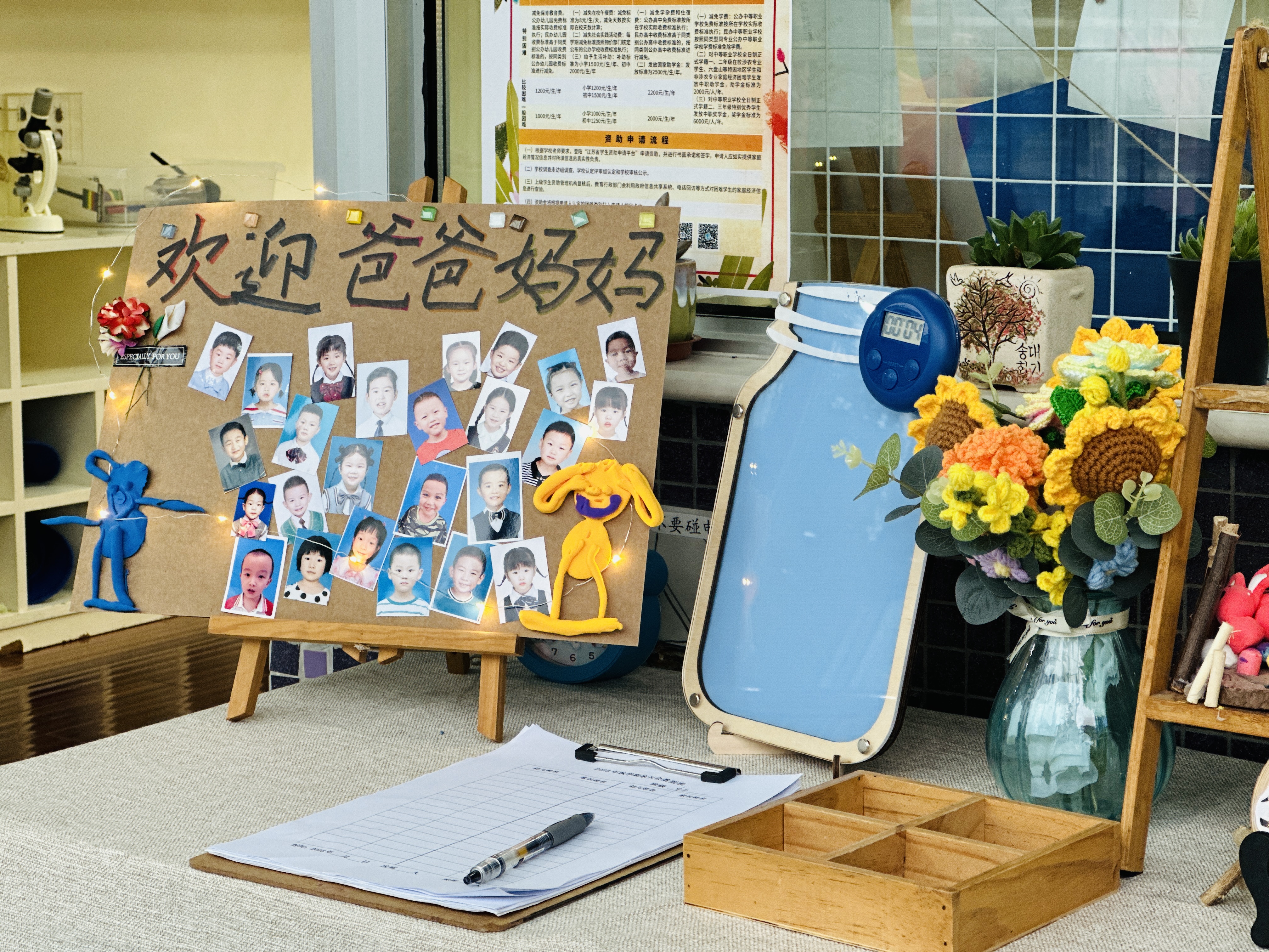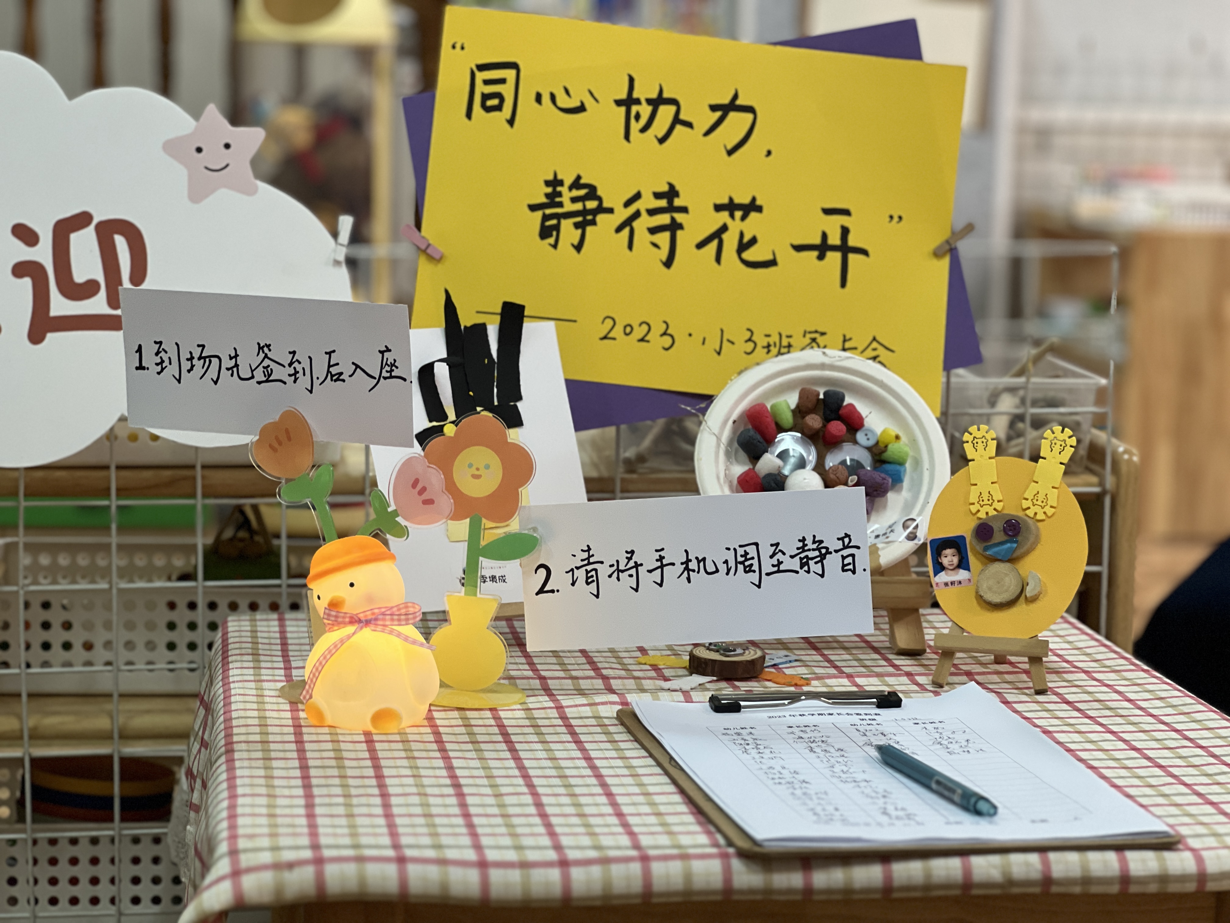 会前,师幼共同精心布置,温馨的签到台、童趣的欢迎留言、明亮干净的教室,一切都在期待着家长们的到来。