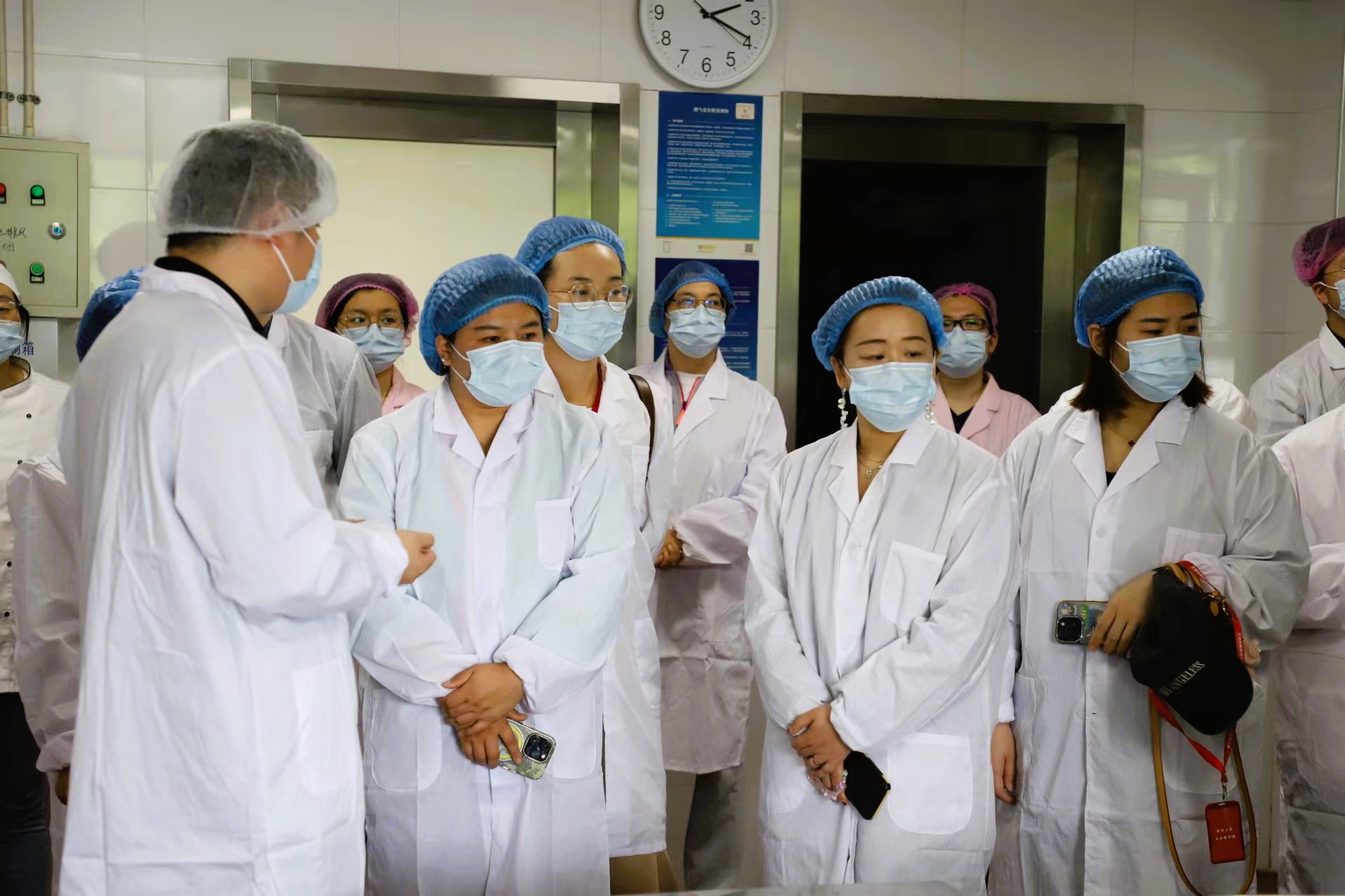 家长们穿戴好口罩、头套、防护衣,做好卫生防护工作,在保健医生带领下走进食堂,亲身考察幼儿园食堂工作。大家通过公示栏信息,全面了解食堂人员的从业资质、健康状态及人员分工等,有序实地参观幼儿园食堂的验收区、粗加工间、烹饪间、备餐间、洗消间。通过食堂服务外包合作单位君来科技服务有限公司王经理的介绍,家长们了解了食堂食品安全管理情况。大家纷纷对食堂卫生环境、工作流程、工作标准表达了充分的肯定,对幼儿园膳食管理工作表示了高度的认可。