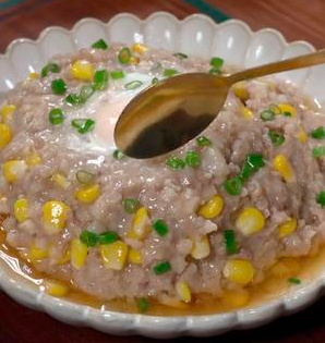 1、玉米剥成粒,新鲜的莲藕剁碎,猪肉剁碎。