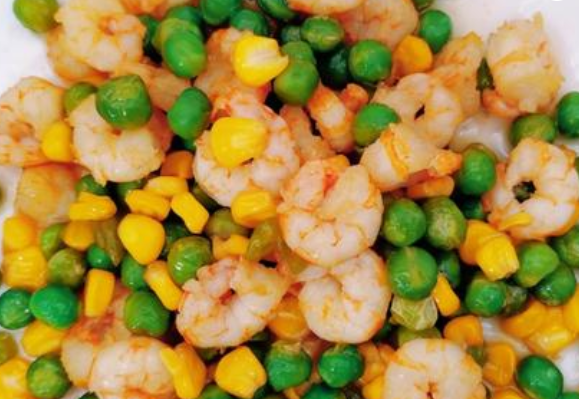 虾仁、青豆、玉米粒、葱姜、食用油、食盐、酱油、淀粉