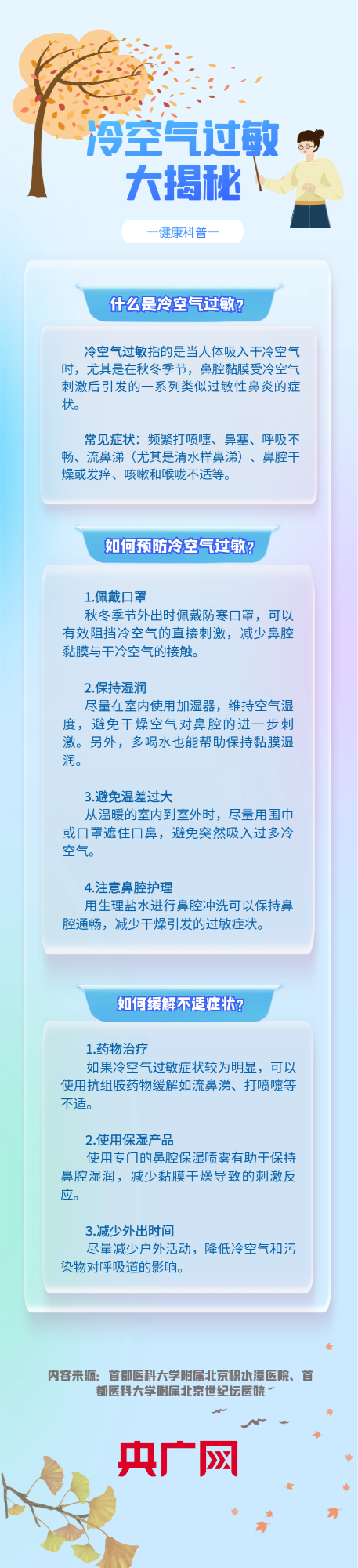 冷空气来袭,有的人会出现鼻塞、鼻痒、流涕、咳嗽等症状,而这些症状常常与普通的感冒或过敏性鼻炎混淆。究竟什么是冷空气过敏?又该如何预防?央广网带你一图读懂!