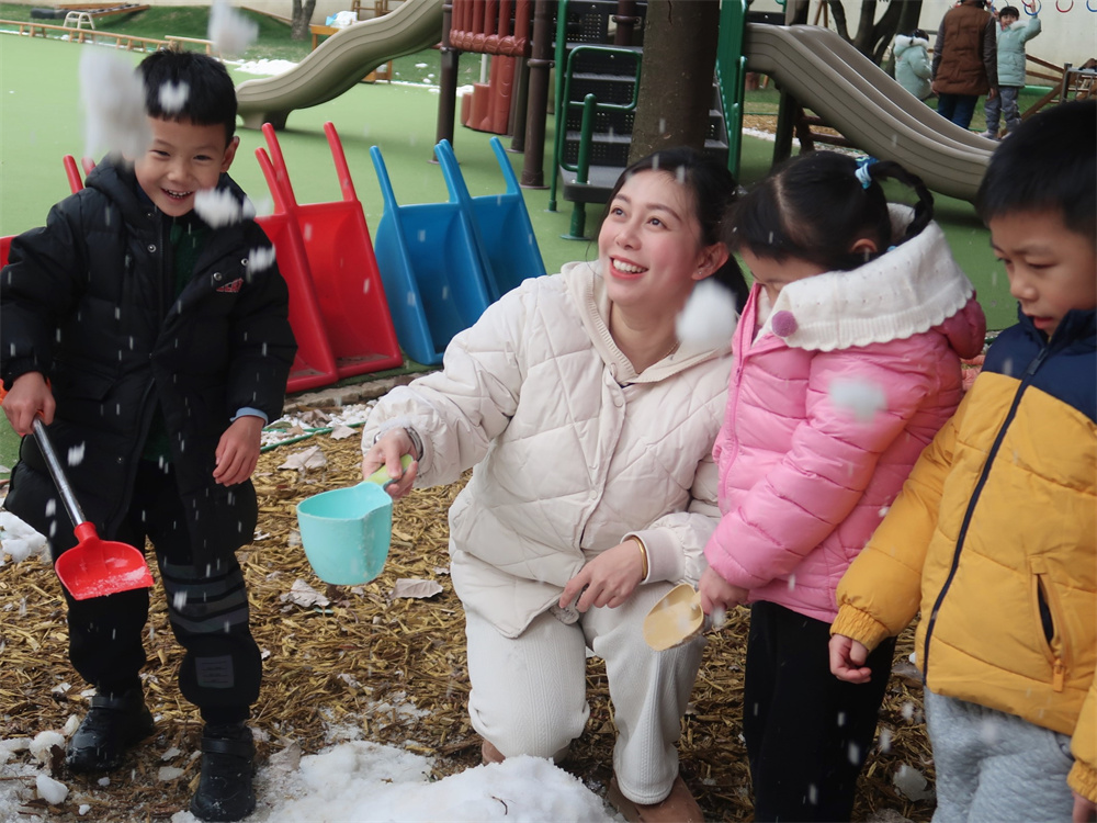 叶玉华老师认为:不论是刚开始幼儿园生活的小班幼儿,还是即将毕业的大班幼儿,都需要情绪情感方面的关注与支持。从幼儿的生活细节到课程建构:“怎样让被起‘绰号’的孩子平复情绪并进一步获得积极的情绪反馈?”“如何让孩子们真实地体验种植劳动的辛劳与收获的快乐?”……这些问题不断萦绕在叶老师的脑海,让她始终思考站在孩子的角度与他们相处、交流,用贴近孩子的方式将他们的游戏与学习引向深入,潜移默化地引导孩子生发积极稳定、专注自信的情绪,提升自主探究、拓展经验的能力。叶老师的童心、细心、耐心、责任心也成为了班级幼儿心中的那抹暖阳……